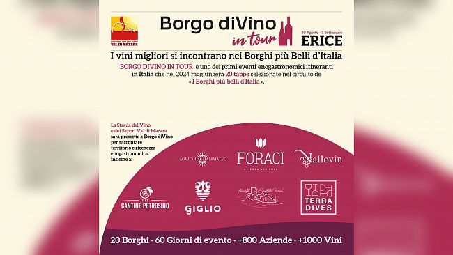 Arriva a Erice, splendido borgo medievale che sovrasta la costa trapanese, la quattordicesima tappa di Borgo DiVino in tour 2024la rassegna enogastronomica di eccellenza organizzatada Valica S.p.a -MarTech company, leader di settore nel marketing tecnologico con un focus specifico su turismo e enogastronomia - in collaborazione con il Consorzio Ecce Italia; l’iniziativa è promossa dall’Associazione “I Borghi più belli d’Italia”ed è patrocinata dall’Associazione Nazionale di Città del Vino.