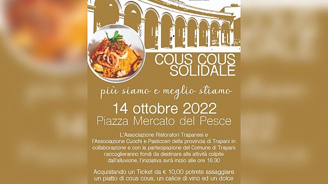 Il mondo della ristorazione e dei cuochi e pasticceri trapanesi, come una grande squadra, si mobilita per sostenere le attività commerciali colpite dai numerosi episodi di alluvione che hanno interessato in queste settimane la città di Trapani. “Cous Cous solidale” è il nome dell’evento organizzato da ART - Associazione Ristoratori Trapanesi e dall'Associazione Provinciale di Cuochi e Pasticceri Trapanesi, che si svolgerà il 14 ottobre, a partire dalle ore 18.30 in Piazza Mercato del Pesce a Trapani.