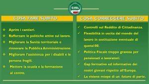 Nel dettaglio, ha aggiunto il segretario generale: “bisogna potenziare il sistema dei controlli sui percettori del Reddito di cittadinanza anche alla luce delle ultime inchieste antimafia, e soprattutto il nuovo governo nazionale deve seriamente pensare a rivedere il sistema che finora è stato solo di natura assistenziale aspetto che, per quanto sia stato fondamentale per molte famiglie in povertà, non ha risolto nulla sul fronte dell’occupazione che è sempre ai minimi storici”. Altro punto da rivedere: “la flessibilità in uscita dal mondo del lavoro, vale a dire o la proroga della quota 100 o altri sistemi altrettanto flessibili per agevolare la pensione e aprire la strada a nuovi posti di lavoro per i giovani”.