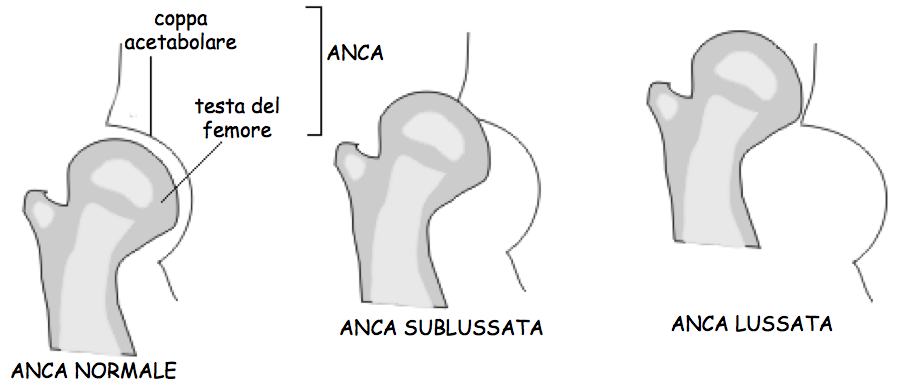 La DCA consiste nell’errato sviluppo della congruenza articolare tra la testa del femore e la cavità deputata ad accoglierla, cioè l’acetabolo, portando ad una deformità, che nei neonati non trattati potrebbe portare ad una graduale lussazione della testa del femore, che tenderà ad uscire dall’acetabolo. In base al grado di severità si potranno avere presentazioni lievi, in cui l’anca all’esame medico risulta mobile all’interno dell’articolazione ma non potrà uscire fuori, quindi si sub-lussa; presentazioni di grado moderato, invece, la testa del femore potrà facilmente essere spinta fuori la cavità nativa, quindi l’anca sarà lussabile. Nei casi conclamati di DCA invece la testa del femore è completamente fuori (lussata) la tasca acetabolare.