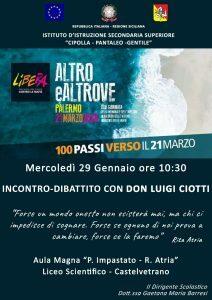 Mercoledì 29 gennaio, presso l’Aula Magna, del Liceo Scientifico “ M. Cipolla” di Castelvetrano, non a caso intitolata, “Peppino Impastato, Rita Atria”, si terrà un incontro_dibattito con Don Luigi Ciotti. L’incontro, organizzato dall’associazione Libera, sortisce una grande importanza in una città tristemente nota come quella di Castelvetrano, martoriata e stigmatizzata,  che vuole prendere le distanze dalla mafia e da ogni forma di illegalità.