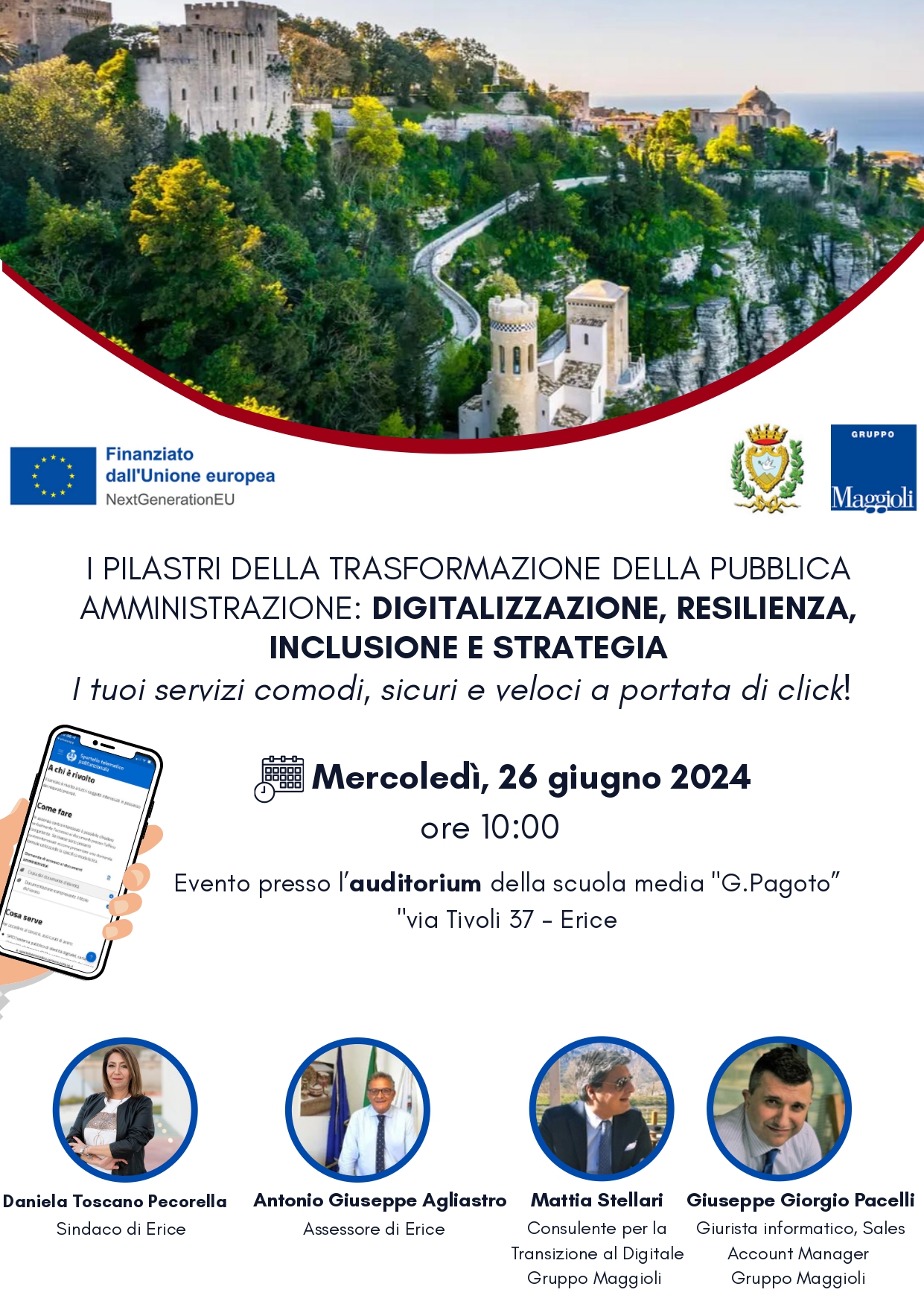 L’evento dal titolo “I pilastri della trasformazione della pubblica amministrazione: digitalizzazione, resilienza, inclusione e strategia” si terrà presso l’auditorium della scuola media “G. Pagoto” di via Tivoli. Per conto dell’azienda Maggioli interverranno il consulente per la transizione al digitale, dott. Mattia Stellari, ed il giurista informatico e sales account manager dott. Giuseppe Giorgio Pacel. Prenderanno la parola anche la sindaca, Daniela Toscano Pecorella, e l’assessore Antonio Giuseppe Agliastro.