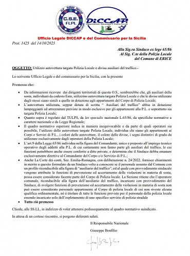 Con una nota legale indirizzata alla sindaca e al comandante della Polizia Locale del Comune di Erice, il Dipartimento Autonomie e Polizie Locali (Diccap) interviene in merito all’utilizzo dell’auto di servizio targata Polizia Locale da parte degli ausiliari del traffico, che in più indossano divise simili a quelle del Corpo.