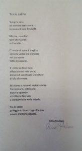 La 26enne di Campobello, laureanda alla facoltà di Giurisprudenza, ha partecipato alla manifestazione letteraria, che ha visto la partecipazione di oltre 1000 persone provenienti da tutto il mondo, con la poesia “Tra le saline” dedicata alle saline di Trapani. Per Anna Stallone, che sin da bambina ha sempre coltivato una forte passione per la poesia, è stata la prima esperienza poetica. A spronarla a partecipare al concorso, dopo aver letto le sue composizioni, è stata la maestra Anna Bono, insegnante in pensione già insignita di diversi premi letterari e molto stimata a Campobello per le sue qualità umane e culturali, oltre che per la sua dedizione in particolare verso i giovani.