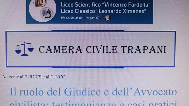 Oggi alle 11:00, presso l'Aula Magna del Liceo “Fardella-Ximenes” a Palazzo Riccio di San Gioacchino in via Turretta a Trapani, si terrà il convegno “Il ruolo del Giudice e dell'Avvocato civilista: testimonianze e casi pratici”. L'evento è organizzato dalla Camera Civile del Tribunale di Trapani nell'ambito delle manifestazioni per la Giornata Europea della Giustizia. Ad aprire i lavori saranno il Dirigente Scolastico dell'Istituto ospitante Filippo De Vincenzi e la Presidente della Sezione Civile del Tribunale di Trapani Daniela Galazzi. Interverranno il Giudice Carlo Salvatore Hamel, l'Avvocato Alberto Lo Giudice e l'Avvocato Federica Magaddino che, inoltre, modererà l'incontro.