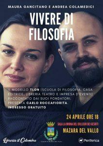 Si svolgerà domani 24 aprile a Mazara l’incontro VIVERE DI FILOSOFIA con i giovani autori Maura Gancitano e Andrea Colamedici, filosofi e ideatori di TLON, scuola di filosofia, casa editrice e libreria teatro, con cui gli autori organizzano in Italia e all’estero numerosi seminari di divulgazione filosofica e non solo.