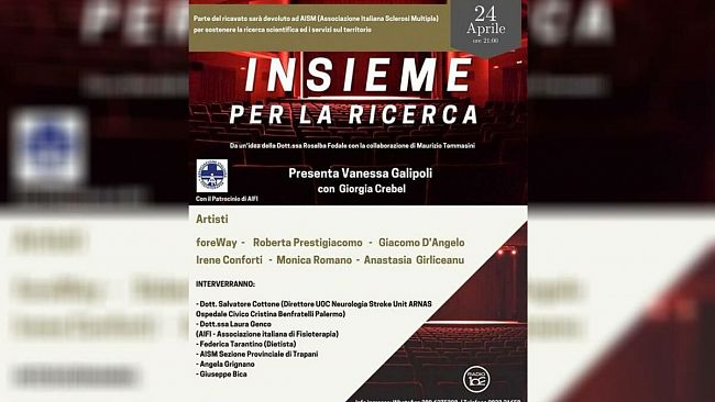 Si terrà, lunedì 24 Aprile alle ore 21.00, presso il Cine Teatro Ariston di Trapani l’evento benefico “INSIEME per la Ricerca”. Da un’idea della Dott.ssa Rosalba Fodale Fisioterapista e Posturologa, in collaborazione con l’Autore e Compositore Maurizio Tommasini, l’evento avrà lo scopo di sensibilizzare l’opinione pubblica sulla patologia sempre più diffusa della Sclerosi Multipla, parte del ricavato sarà devoluto ad AISM – Associazione Nazionale Sclerosi Multipla che da anni si occupa di ricerca, cura e sostegno dei pazienti e delle famiglie.