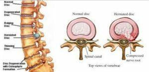 Tra le cause maggiori invece, ritroviamo: l’ernia del disco, spondilolistesi (spostamento in avanti o indietro di una vertebra rispetto alla contigua), stenosi del canale vertebrale, frattura, tumori ed infezioni. Sicuramente l’ernia del disco è la più comune tra le sopracitate, essa non è altro che la fuoriuscita, totale o parziale, dal disco intervertebrale, della sua porzione più interna, nota come “nucleo polposo”; questo nucleo quando migra all’esterno del disco può causare una compressione delle radici o dei nervi viciniori e causare dolore sia di tipo localizzato, che irradiato, il più delle volte, agli arti inferiori (lombosciatalgia o lombocruralgia).
