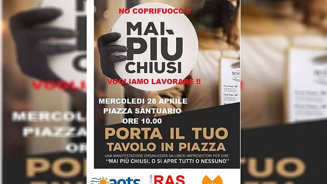 "Mai più chiusi" è il flash mob organizzato da Ras (Ristoratori Associati Sanvitesi) che si terrà domani 28 Aprile alle 10 in Piazza Santuario a San Vito Lo Capo. Si manifesterà tutto il dissenso contro l'ultimo decreto del Governo Draghi, visto da tutta la categoria del settore assolutamente insufficiente a permettere una concreta ripartenza della ristorazione. Infatti, ciò che viene criticato fortemente è essenzialmente: