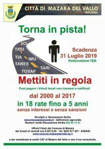 Mazara: entro il 31 luglio le domande a Riscossione Sicilia per la Rottamazione Ter    Anche i tributi locali non riscossi dal Comune e notificati dal 2000 al 2017 potranno essere pagati in 5 anni senza sanzioni e interessiScade il 31 luglio 2019 il termine ultimo per aderire alla Rottamazione Ter dei tributi.    Anche i tributi locali non riscossi dal Comune e notificati dal 2000 al 2017, che sono iscritti a ruolo dall’agente di riscossione, potranno essere rateizzati fino a 5 anni, evitando sanzioni ed interessi.    Le domande vanno presentate direttamente all’agente “Riscossione Sicilia”.
