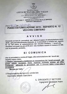 Possibilità di rinnovo delle concessioni (entro il 31 dicembre 2019) dei loculi occupati da oltre 50 anni Con un avviso a firma del dirigente del 3° settore comunale ing. Giuseppe Asaro e del responsabile del servizio cimiteriale Alberto Gancitano, il Comune annuncia che dovendo attuare il piano di estumulazione del reparto n. 12 del vecchio cimitero si è provveduto a censire i loculi che risultano occupati da oltre 50 anni. L’elenco è pubblicato all’albo pretorio online (vedi http://albo.comune.mazaradelvallo.tp.it/albo/albo_dettagli.php?id=15715) ed è disponibile presso gli Uffici Cimiteriali.