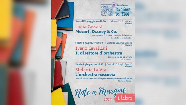 L'Associazione Jacopone da Todi presenta l'edizione 2024 di "Note a Margine", il "brand" che dal 2007 ha identificato gli incontri di riflessione e approfondimento che l'associazione cura e organizza, ospitando persone che, per le ragioni più disparate, sono vicine al mondo della musica e della cultura. Quest'anno la manifestazione si chiama "i libri" e coniuga il fascino della musica con la passione per la lettura. Gli incontri si terranno in due suggestivi luoghi di Alcamo: la Chiesa del SS. Ecce Homo (che per un lungo periodo in passato è stata sede delle attività dell'associazione) e l'Oratorio del Collegio dei Gesuiti. Questo evento rappresenta una straordinaria occasione per immergersi in approfondite riflessioni su temi che spaziano dalla musica classica al cinema, dall'arte della direzione d'orchestra alla storia di strumenti unici.