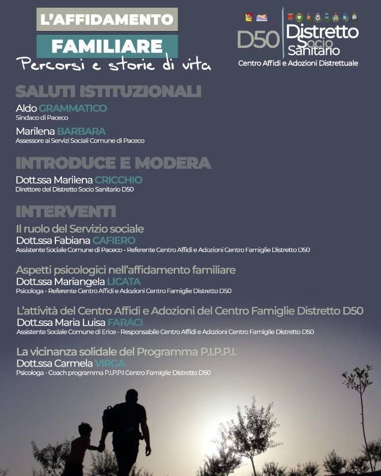 Domani, giovedì 27 giugno, con inizio alle 17, l’aula consiliare di Paceco ospiterà un incontro di sensibilizzazione e informazione sul tema dell’affidamento familiare, promosso dall'Assessorato comunale ai Servizi sociali in collaborazione con il Centro Affidi e Adozioni del Distretto socio-sanitario D50.«È un incontro rivolto alle famiglie, ai cittadini “di buona volontà”, alle organizzazioni sociali, alla parrocchia e ai gruppi parrocchiali – anticipa l’assessore Marilena Barbara – finalizzato a sollecitare la riflessione sull'affido familiare, a comprendere meglio come funziona e quali sono le procedure. L’iniziativa, promossa dal nostro Servizio Sociale insieme al Distretto D50, è una grande occasione per consolidare relazioni sociali di comunità, oltre che essere uno strumento di coesione sociale».