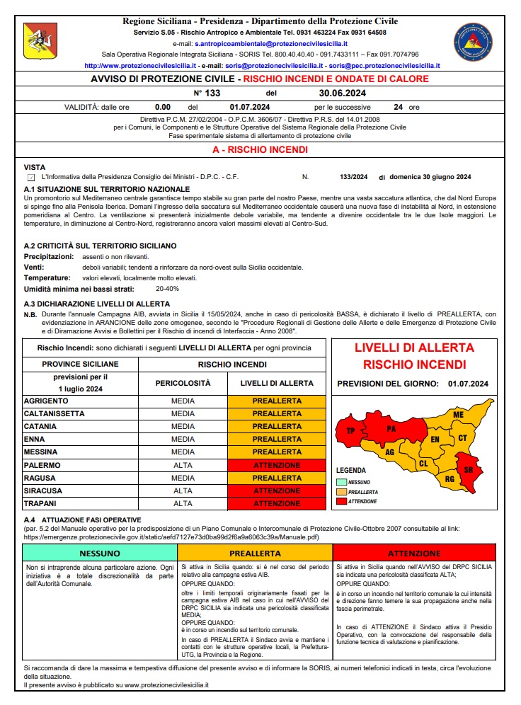 La Protezione civile regionale ha diramato un avviso sul rischio di incendi e di ondate di calore, prevedendo per questo territorio una pericolosità ALTA ed uno stato di attenzione “dalle ore 00 del 1° luglio 2024 e per le successive 24 ore”.
