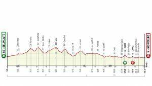 Partenza lungo la costa per un attraversamento dell’entroterra che presenta la scalata dell’unico GPM di giornata a Ragusa con il passaggio a Ibla. Segue una lunga parte a scendere su stradoni prevalentemente rettilinei fino a raggiungere il mare a Gela e proseguire verso l’arrivo. Gli ultimi 10 km percorrono la costa con lievi ondulazioni fino alle porte di Licata dove si svolta a sinistra per poi attraversare l’abitato con alcune curve ad angolo retto fino all’ultima che immette nel rettilineo di arrivo in leggera salita.