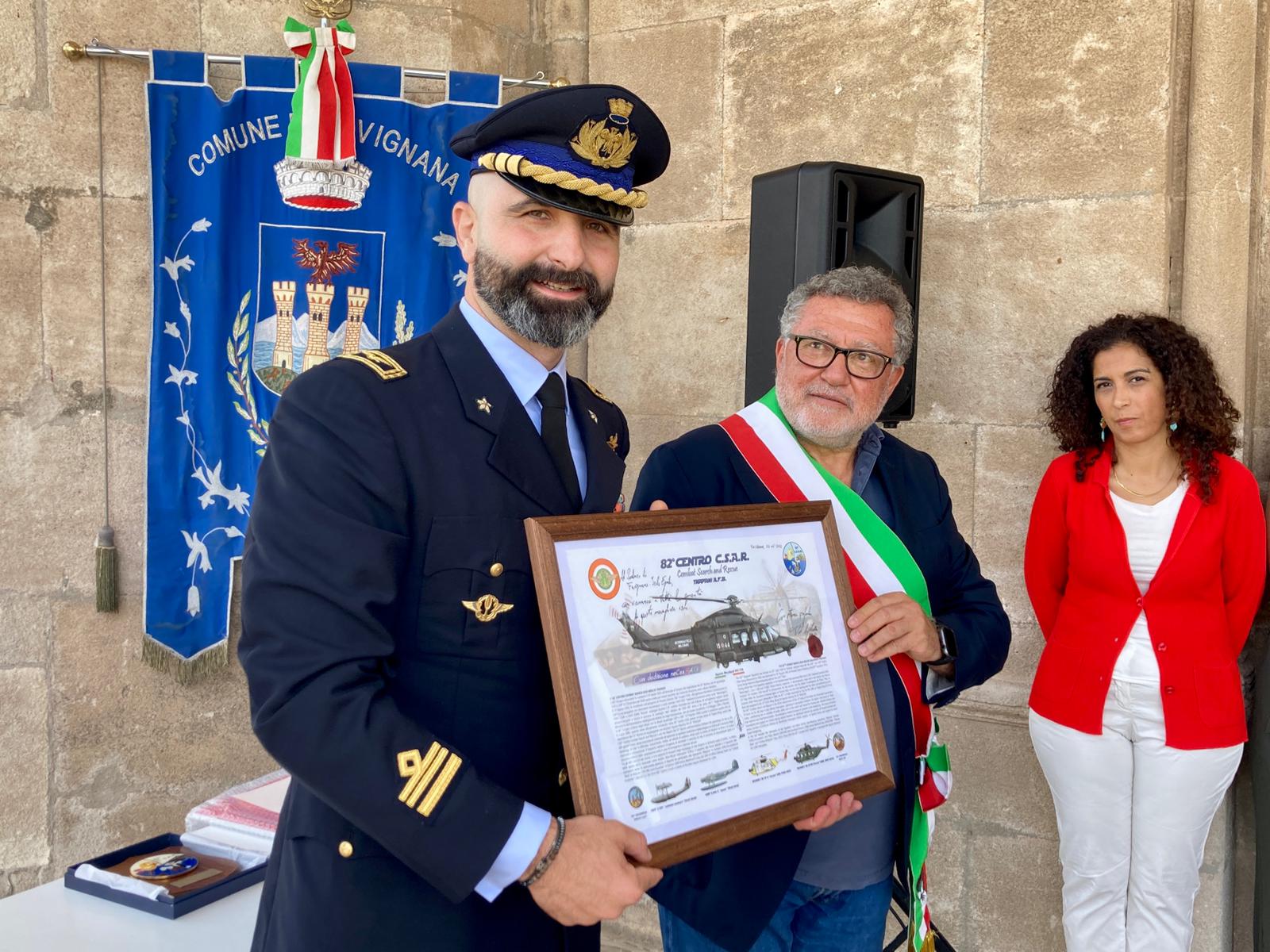 Nella stessa occasione il Comandante ha consegnato al Sindaco lo Stemma del Reparto, la Litografia firmata dal personale navigante, e la fotografia dell’atto di deposizione del rostro risalente alla Battaglia delle Isole Egadi presso il Castello di Punta Troia a Marettimo, avvenuta lo scorso 13 settembre 2021 proprio a opera di un equipaggio di volo dell’82° Centro Combat SAR.