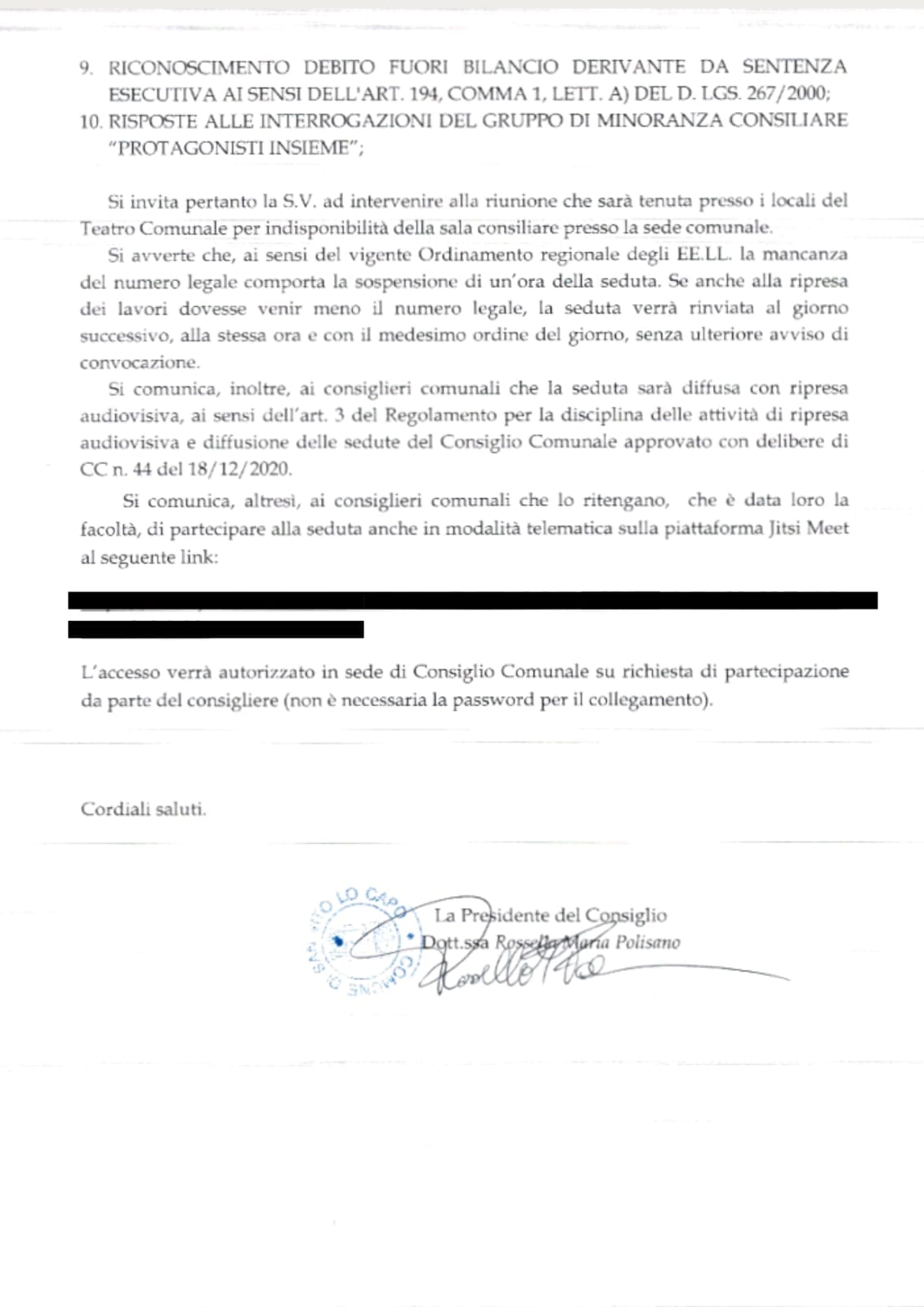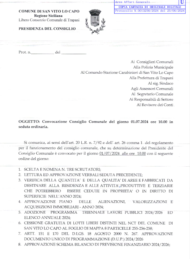 Si rende noto ai cittadini che è stato convocato per il giorno 01/07/2024 alle ore 10:00, presso il teatro comunale "Padre Anselmo Caradonna", il Consiglio Comunale con i seguenti punti all'ordine del giorno