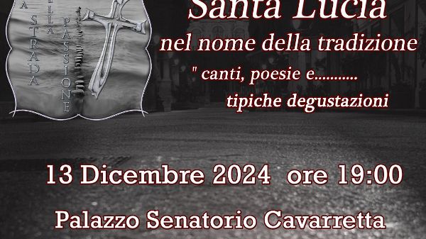 L’Associazione La Strada della Passione, in collaborazione con l’Unione Maestranze, ha il piacere, anche quest’anno, di comunicare che, in occasione della Solennità di Santa Lucia, il giorno 13 dicembre dalle ore 19,00, distribuirà gratuitamente la tradizionale cuccìa ed il vino cotto, davanti il Palazzo Senatorio Cavarretta di Trapani , dove si terrà l’esibizione del gruppo musicale siciliano “I Murritiusi”;