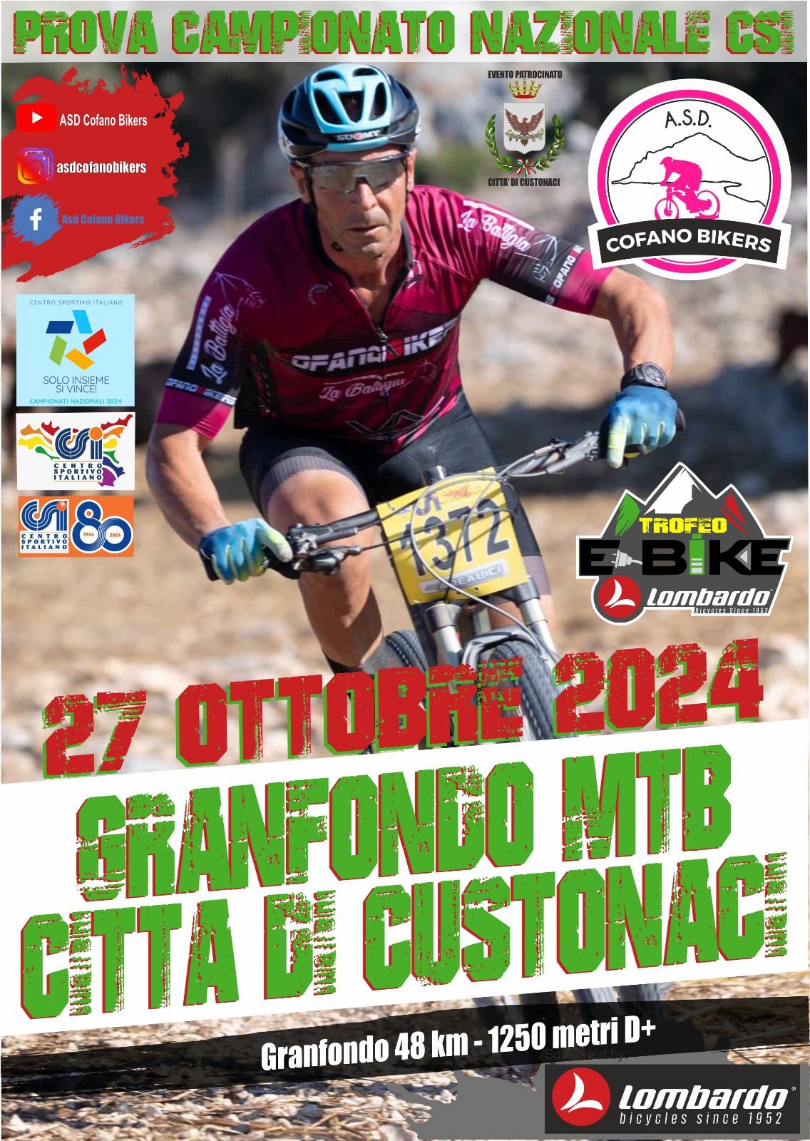 Si disputerà domenica 27 ottobre la Granfondo MTB «Città di Custonaci», gara valevole per il Campionato Regionale CSI e quest'anno anche prova unica del Campionato Nazionale, con l'assegnazione dei titoli di categoria. La manifestazione sportiva, giunta ormai alla terza edizione, è organizzata dall’ASD Cofano Bikers e si svolgerà interamente nel territorio custonacese, attraversando alcuni dei luoghi più caratteristici della cittadina collinare: Baia Cornino, Grotta Mangiapane, Parco Cerriolo e Monte Sparacio.