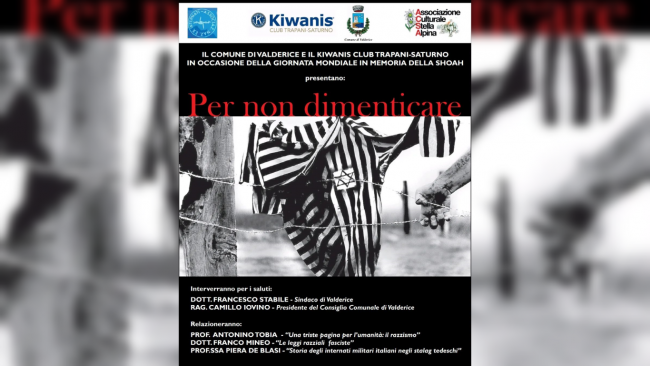 Non dimenticare la tragedia della Shoah. E' l'obiettivo del Comune di Valderice che, in collaborazione con il Kiwanis Club Trapani - Saturno, ha organizzato un momento di riflessione giovedì 24 gennaio alle 17.30 al Molino Excelsior.