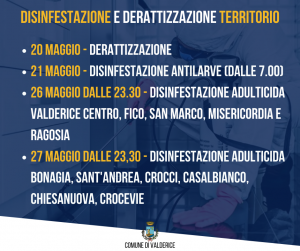 Iniziati già nel corso della giornata di ieri, per proseguire per la settimana, gli interventi di derattizzazione e disinfestazione nel territorio di Valderice. In data 22 maggio 2020, invece, a partire dalle ore 15.00, verrà effettuato un intervento di sanificazione degli edifici comunali che saranno nuovamente fruibili a partire dalle ore 8 del 23 maggio 2020.