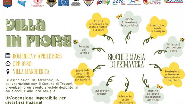 Un appuntamento imperdibile per bambini e famiglie, all’insegna della creatività, e del divertimento. L'iniziativa, intitolata "Villa in fiore, giochi e magia di primavera", organizzata dalle associazioni locali in collaborazione con il Comune di Trapani, è l’occasione perfetta per vivere una giornata speciale a contatto con la natura.