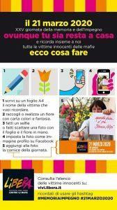 Plaudiamo all’iniziativa di Libera, che ha deciso di celebrare la Giornata attraverso una campagna social”. Per partecipare alla campagna: ‘Un nome, un fiore” basta collegarsi alla pagina facebook: https://www.facebook.com/78702951744/posts/10157917128231745/ “Il ricordo delle vittime di mafia - concludono i vertici del Consorzio - è un ulteriore incentivo ad operare sul versante della gestione dei beni confiscati alla mafia, nell’ambito delle attività di educazione, formazione e sensibilizzazione ai temi della legalità e dello sviluppo sociale ed economico”.